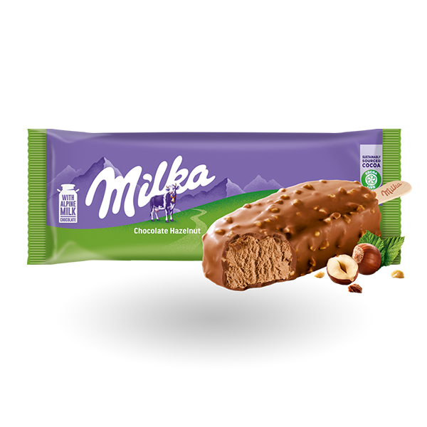 De Milka Chocolate Hazelnut wordt verkocht in een verpakking die de versheid en kwaliteit van de chocolade behoudt.