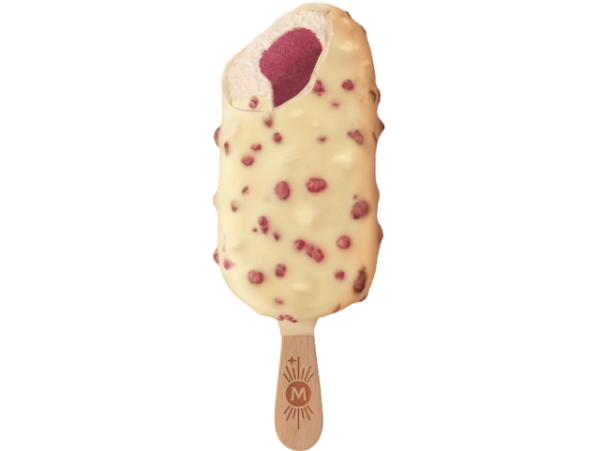 Geniet van romig aardbeienijs met een heerlijke swirl van aardbeiensaus omhuld met een dikke laag witte chocolade.