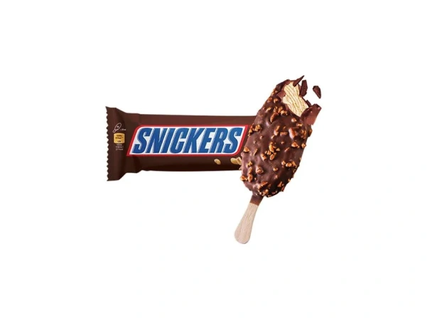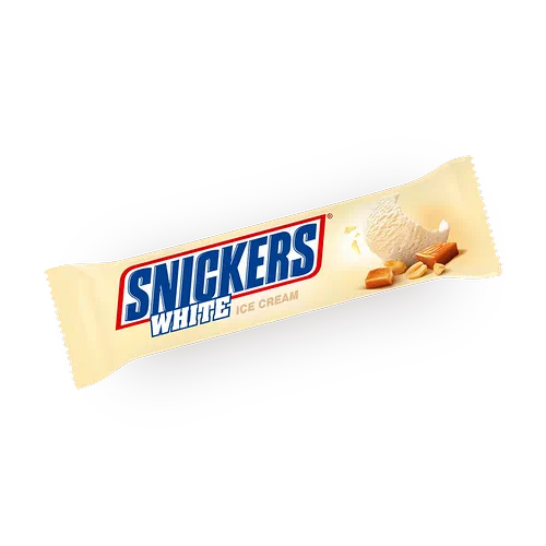 Snickers Extra White, een bevroren dessertsnack met toegevoegde room, karamelsiroop, gekarameliseerde pindachips in een coating, bevat witte chocolade